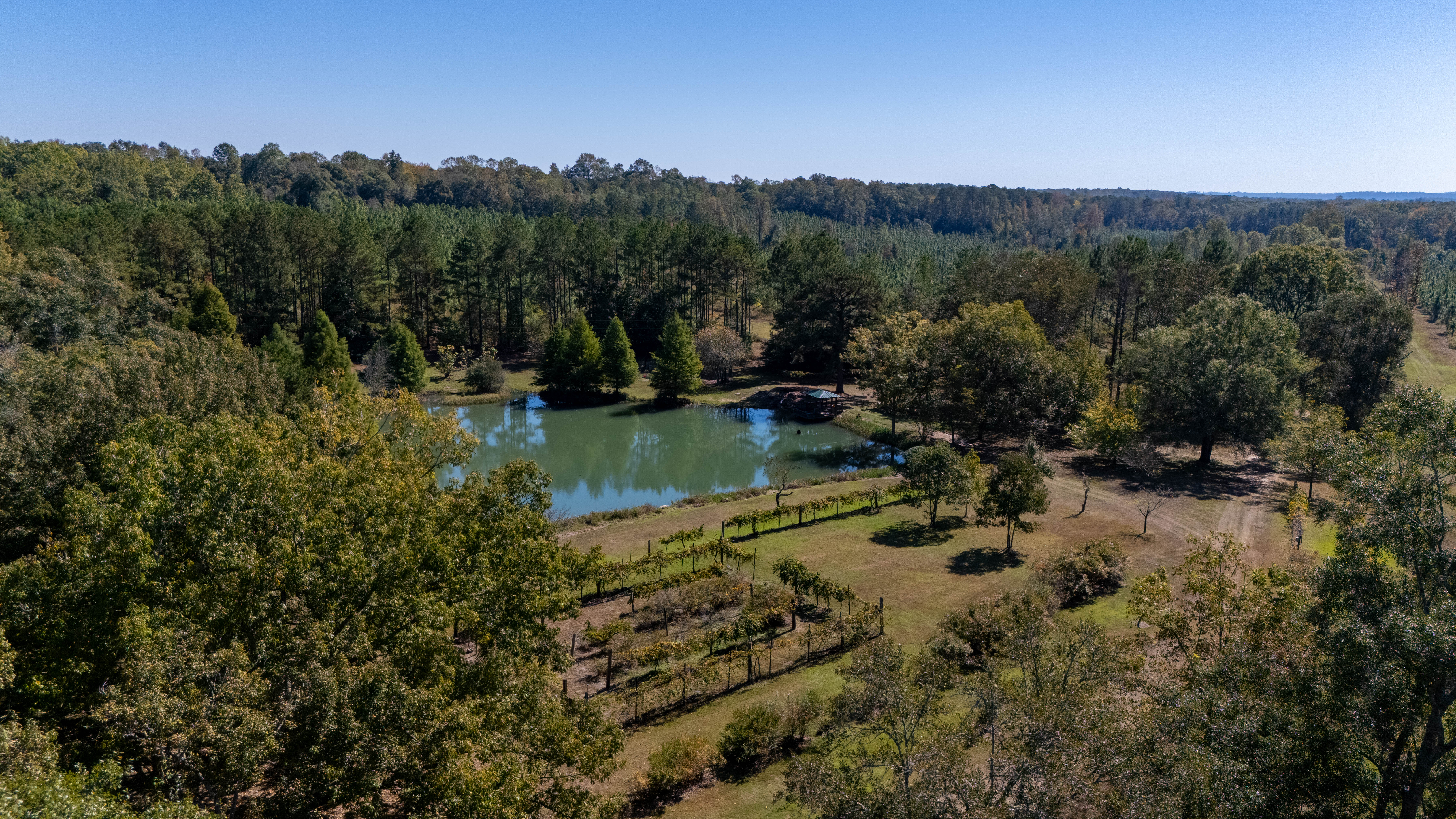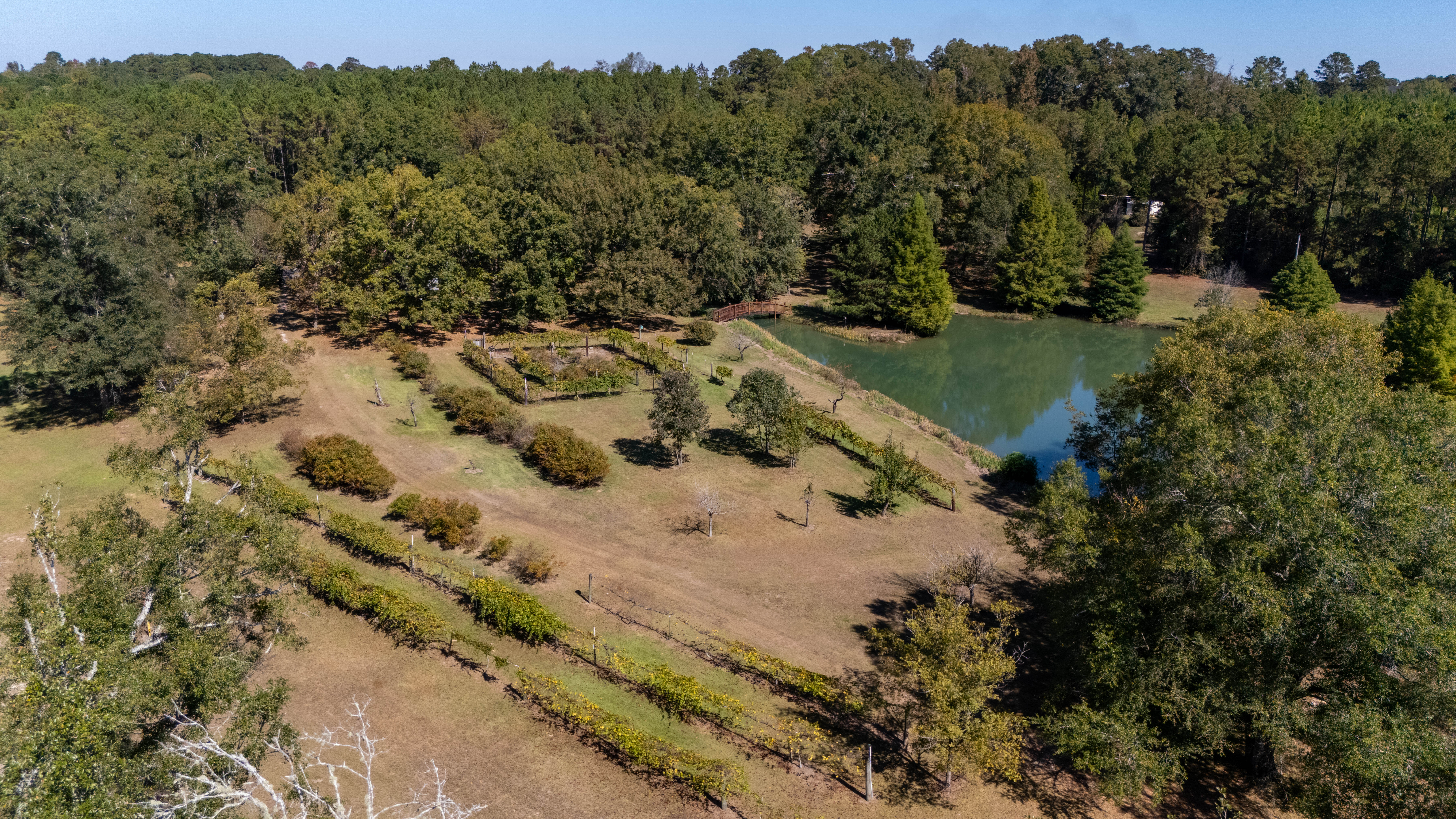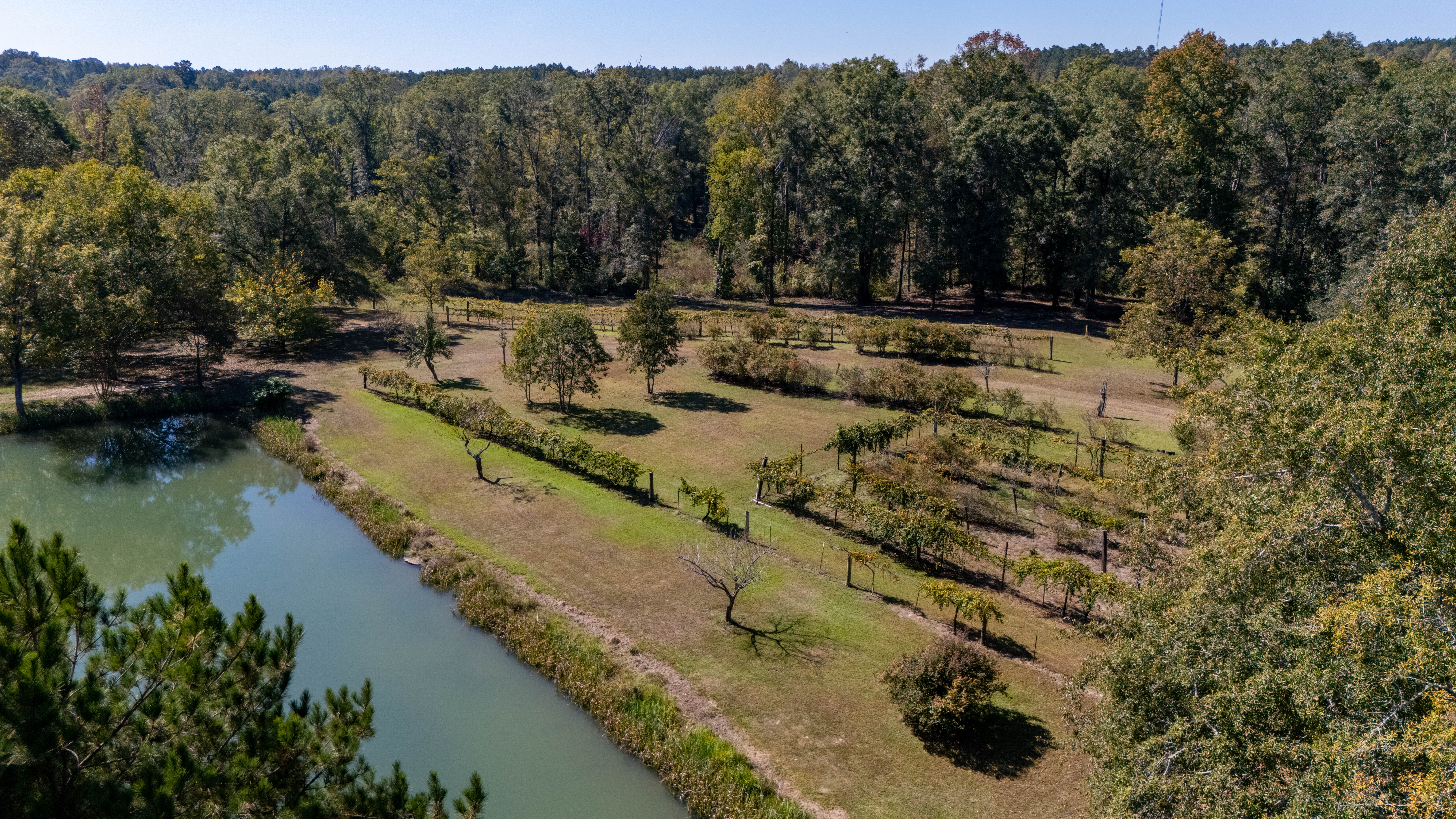 Just beyond, a vineyard of muscadine vines, blueberry rows, and pear and peach trees offers seasonal harvests and the satisfaction of tending what nourishes you. The approx. 10-acre fenced inner yard keeps pets close and unwanted wildlife at the edges where they belong.