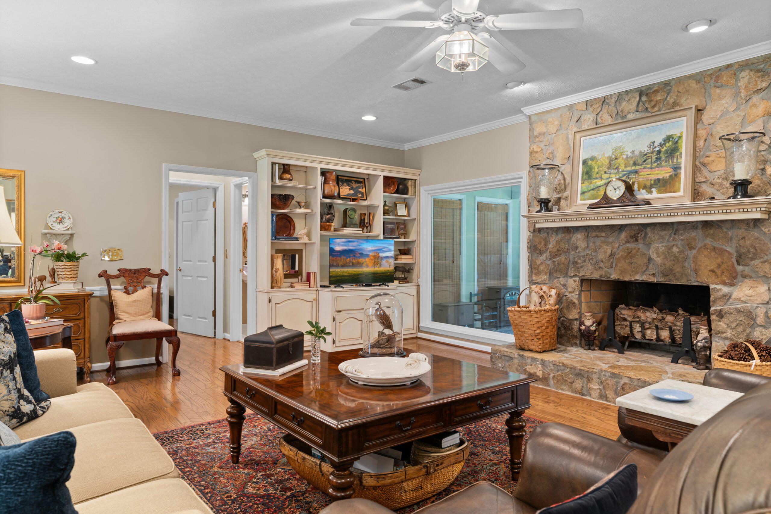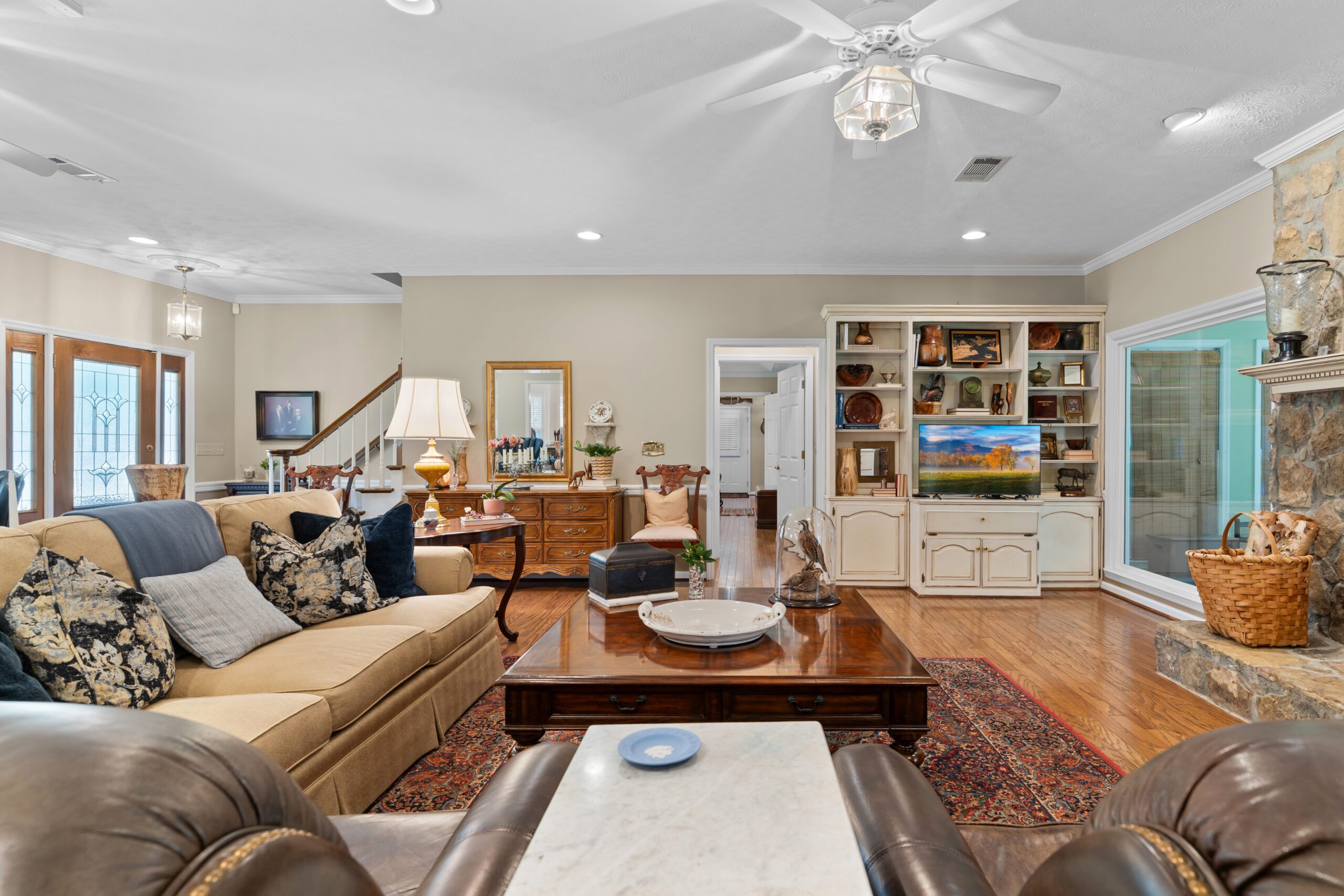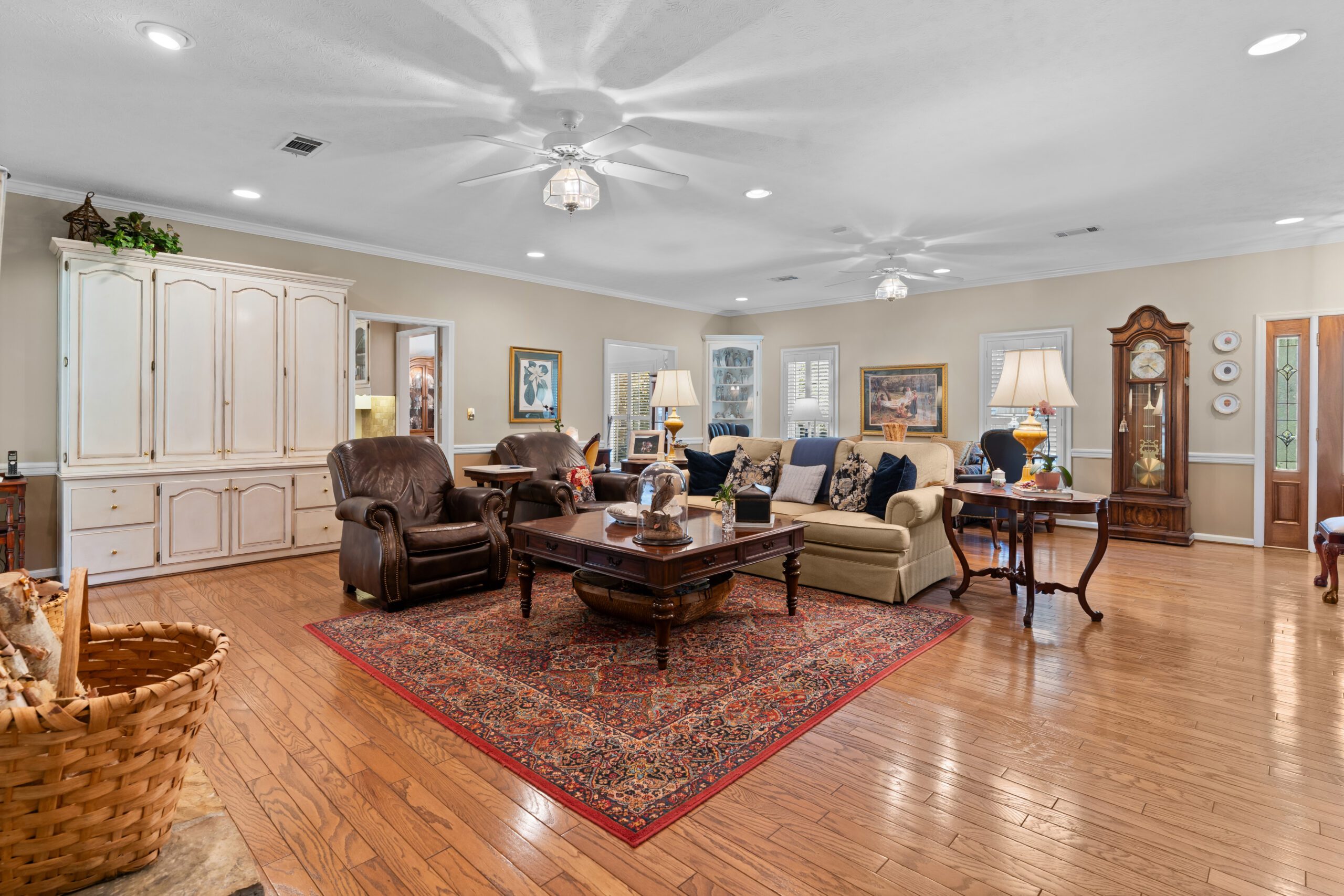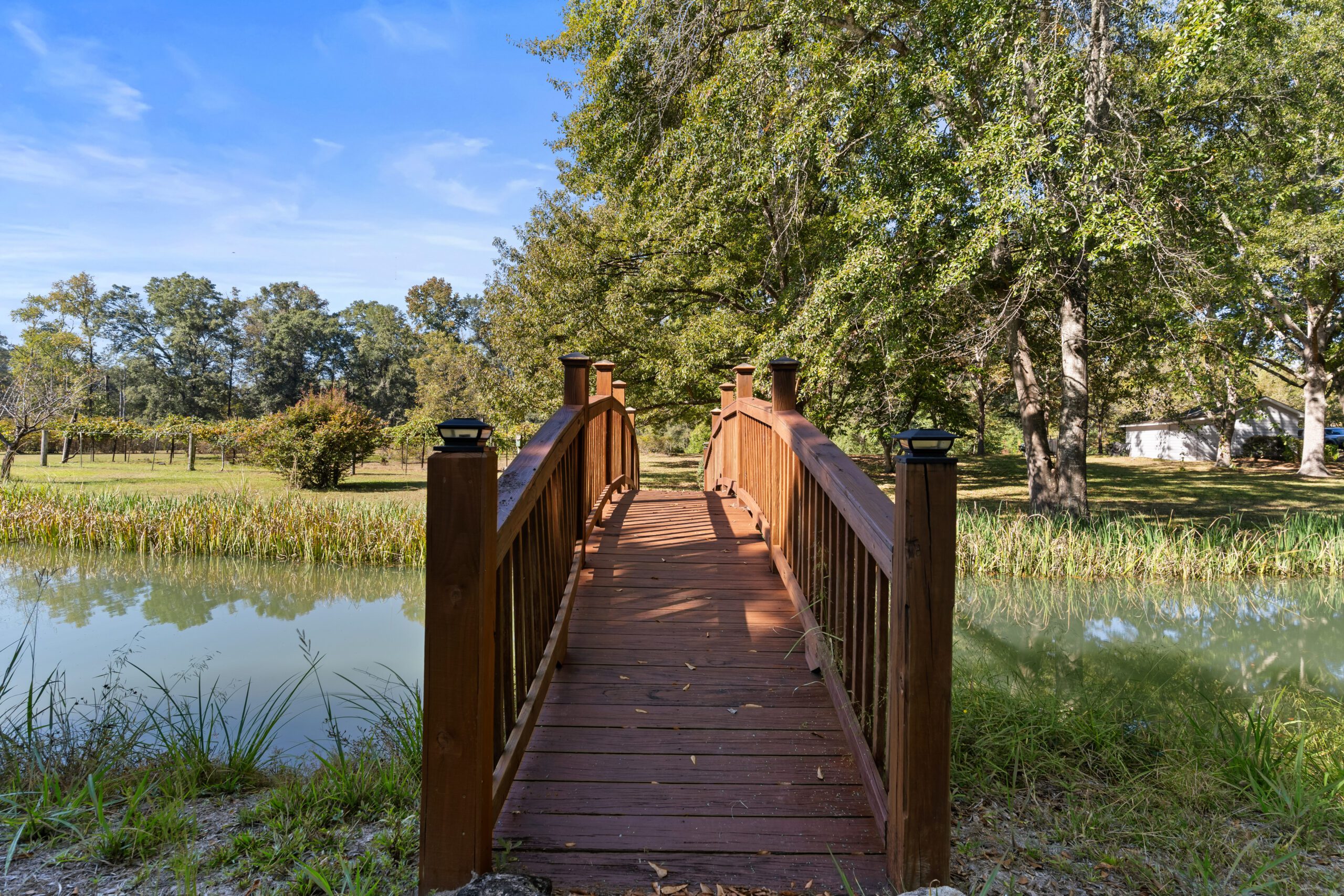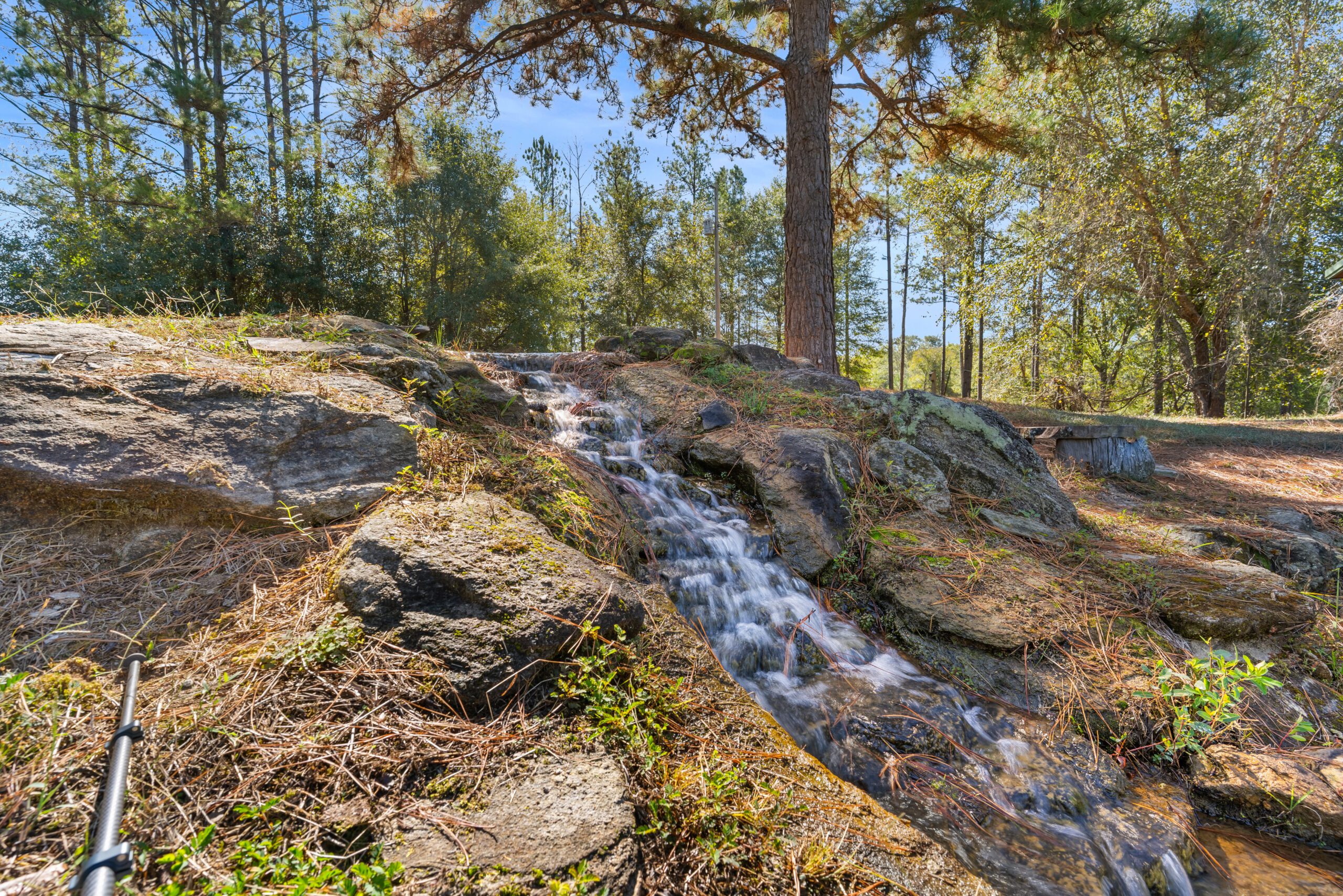 Behind the home, a canopy of mature water oaks creates a cool, shaded backdrop for quiet mornings, family gatherings, and children running barefoot through the grass. Steps away lies the spring-fed pond, clear and alive with bass and bream. A covered pier, a footbridge over an inlet, and a gazebo at the water’s edge make it a perfect place for sunrise coffee, evening fires, or simple stillness.