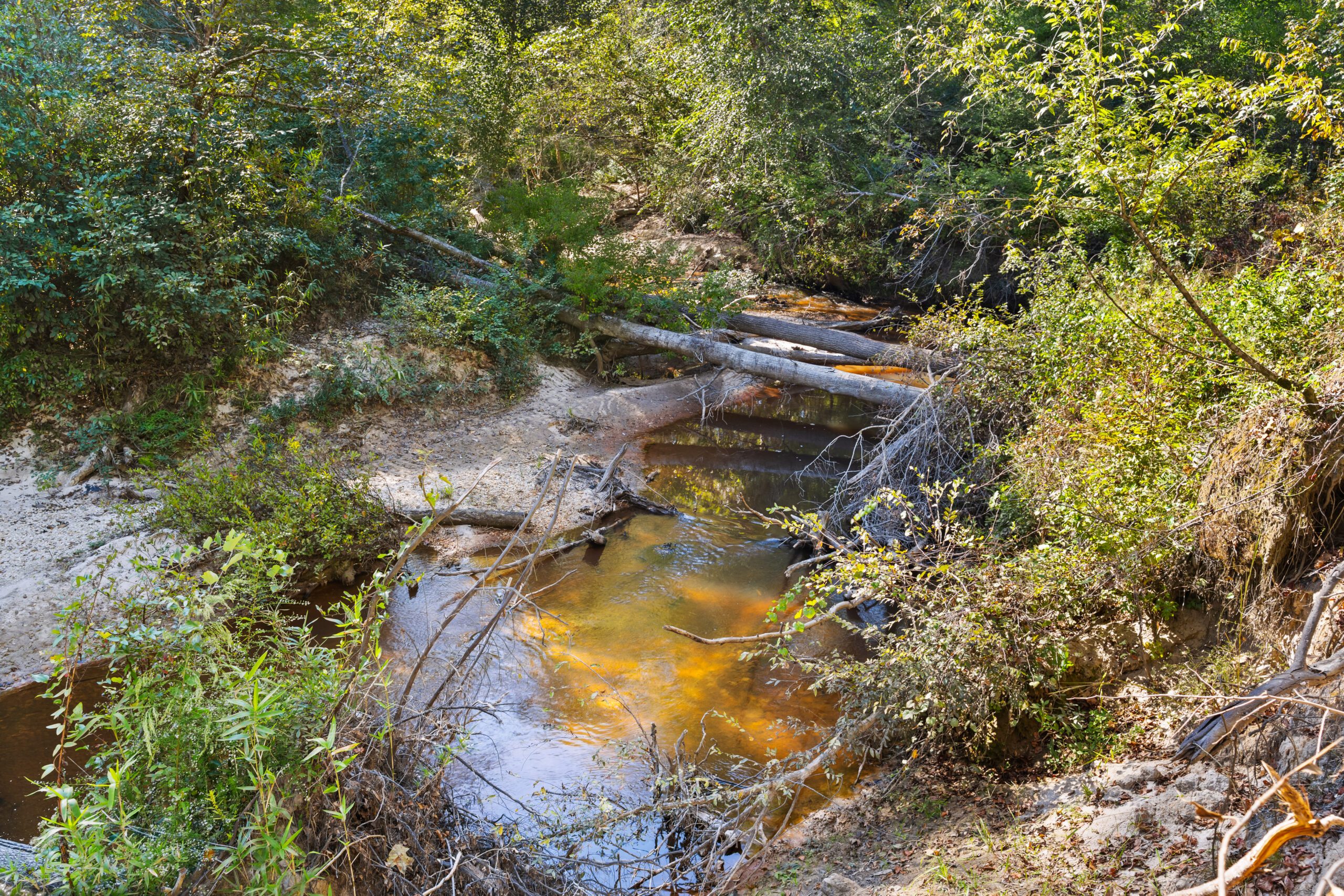 As you open the gate to leave the fenced yard, the land transitions into its wilder character. Here, the hunter and land steward will find their element: a beaver pond awaiting migrating ducks, well-maintained shooting lanes, two additional sawtooth groves, a longleaf pine stand that has been properly burned, a roughly one-acre pump-fed duck impoundment, and over half a mile of Ihagee Creek frontage set among mature hardwood bottoms.